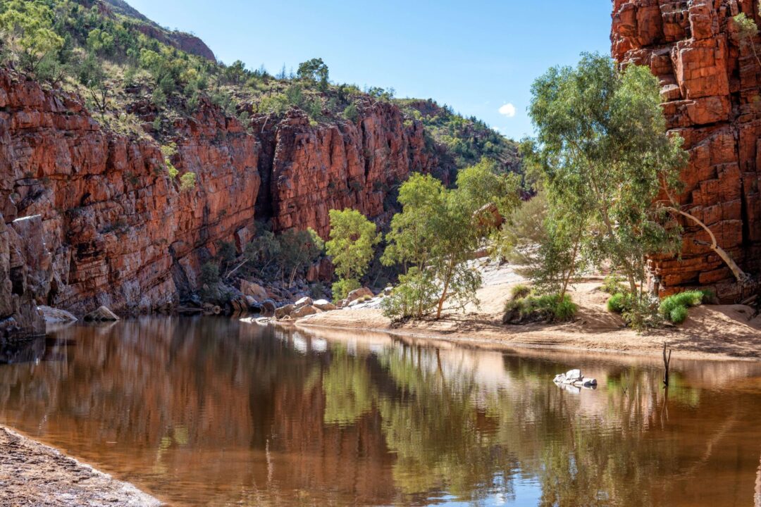 De Ormiston Gorge ligt op ongeveer anderhalf uur rijden van Alice Springs en vormt de perfecte plek om een dag in de West MacDonnell’s te eindigen. Onderweg vanuit Alice Springs maak je stops bij Simpsons Gap (hou je ogen open voor de zwartvoet-rotskangoeroe), Standley Chasm (bezoek rond het middaguur, wanneer de rotsen in brand lijken te staan) en de kleurrijke Ochre Pits. Bij de Ellery Creek Big Hole kun je verkoeling zoeken in de waterhole, maar je kunt dus ook gewoon bij Ormiston Gorge zwemmen.